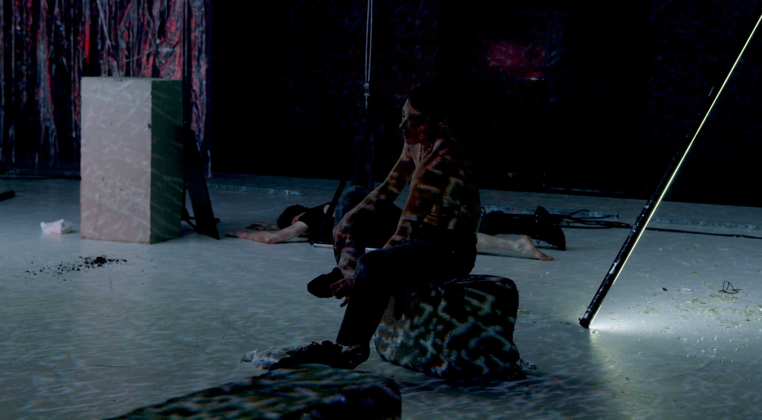 Collapse in 5 Acts ist über zwei Jahre hinweg gemeinsam mit der Kollaborateurin Jen Rosenblit entstanden, mit Laboren in Berlin, Zürich und New York und einem Symposium in Brooklyn, das sehr passend In Our Decline hieß. Einer der wichtigen Denkanstöße kam vom queeren Theoretiker Jack Halberstam, der sich gerade mit der Ästhetik des Kollapses und dem Konzept des unworlding beschäftigt. (Keine Sorge, wir wussten auch nicht, was das ist.)
